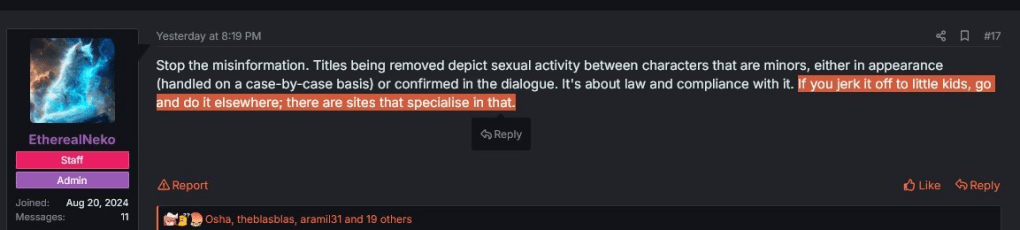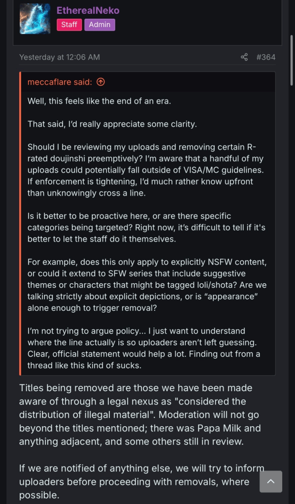 According to more reports, EtherealNeko, one of the admins for MangaDex, stated that this recent move comes in accordance with UK law, as their registration is specifically incorporated in the UK. According to UK law, depictions of fictional underage characters in sexual contexts can fall under strict obscenity laws, even if no real minors are involved.